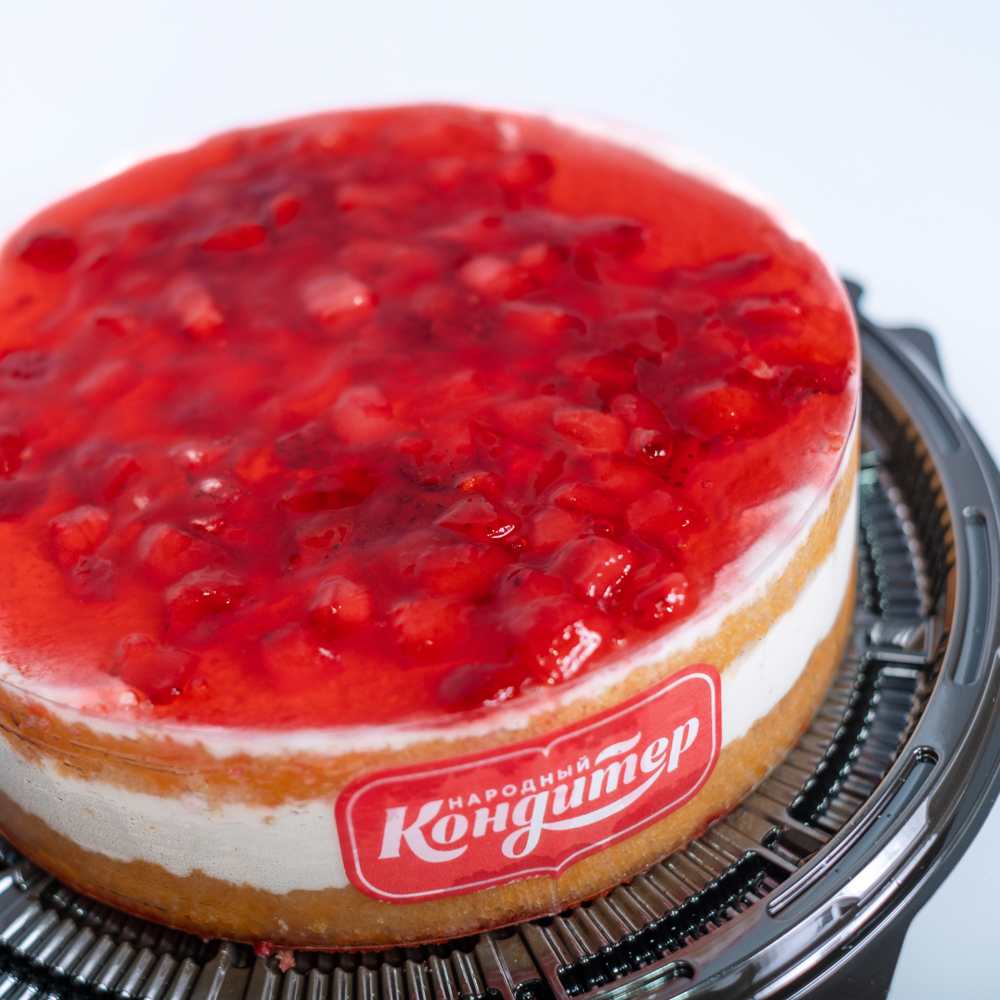 Лёгкий, воздушный бисквит. Нежный крем по вкусу напоминающий мороженое пломбир. Торт сверху украшен клубникой, покрытой кондитерским гелем.