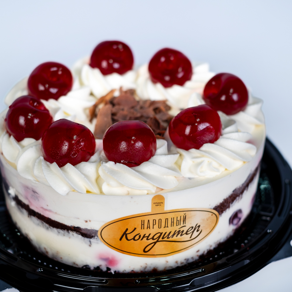 Состав: яйцо куриное, мука пшеничная в/с, крахмал пшеничный, сахар, какао порошок натуральный, масло подсолнечное, сыр маскарпоне сгущенное молоко ГОСТ, молочные сливки натуральные, ванилин, вишня с/м, желатин, шоколад темный, вишневый сок.