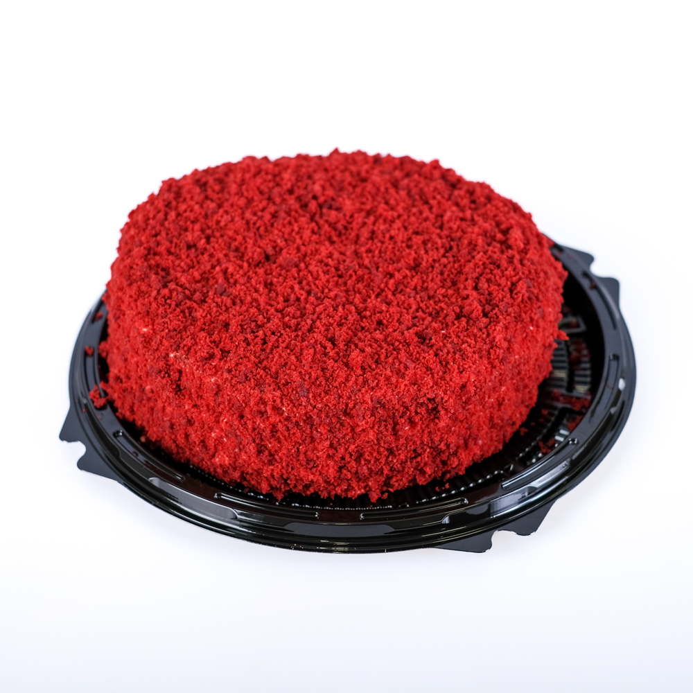 Насыщенный торт "Красный Бархат" с бархатистым бисквитом, кремом на основе сливочного сыра и малиновым конфитюром. Небольшое количество карамельной начинки с солью придает дополнительную глубину и пикантность вкусу торта.