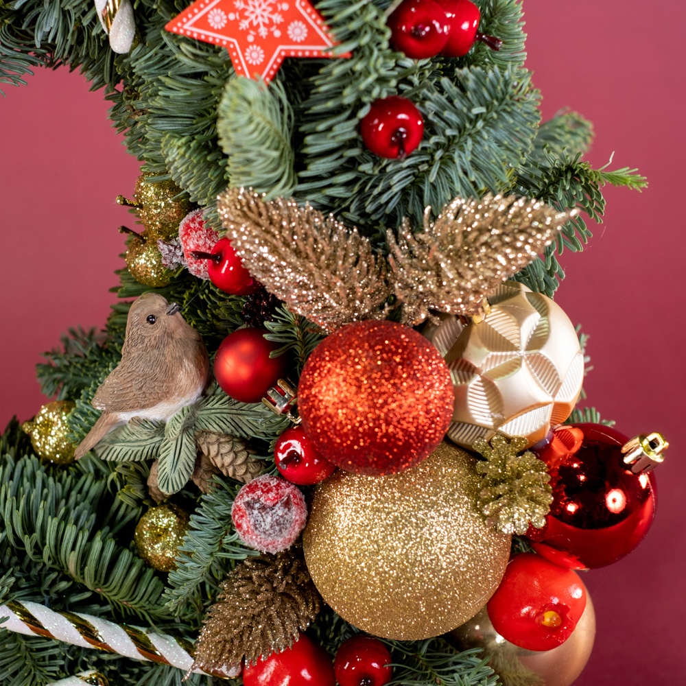 Состав композиции: нобилис, ёлочные украшения, игрушки, ленты