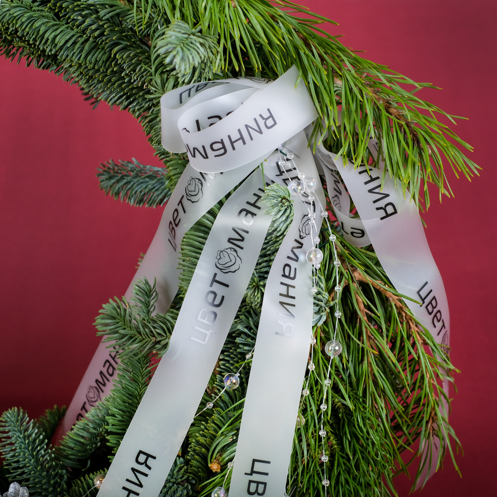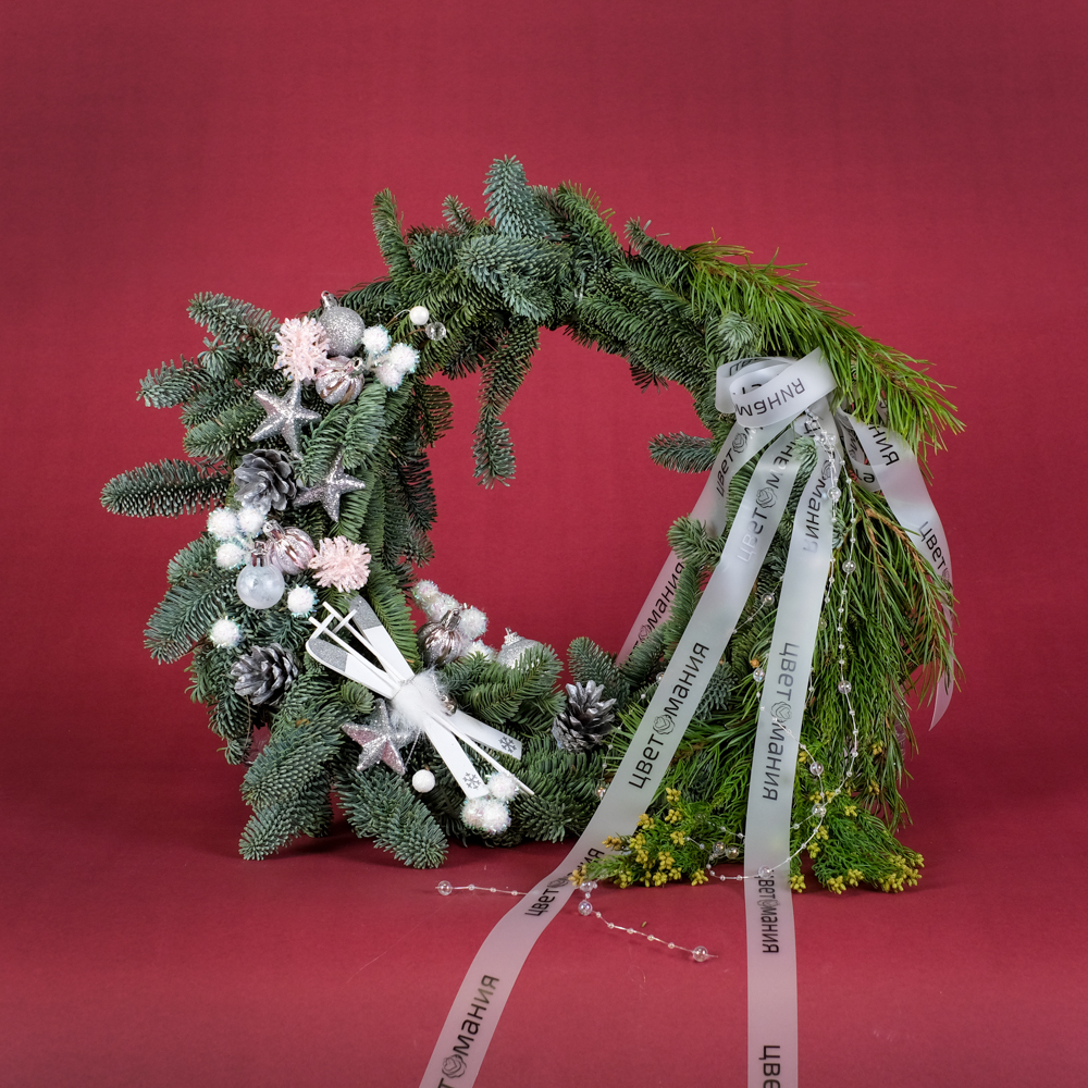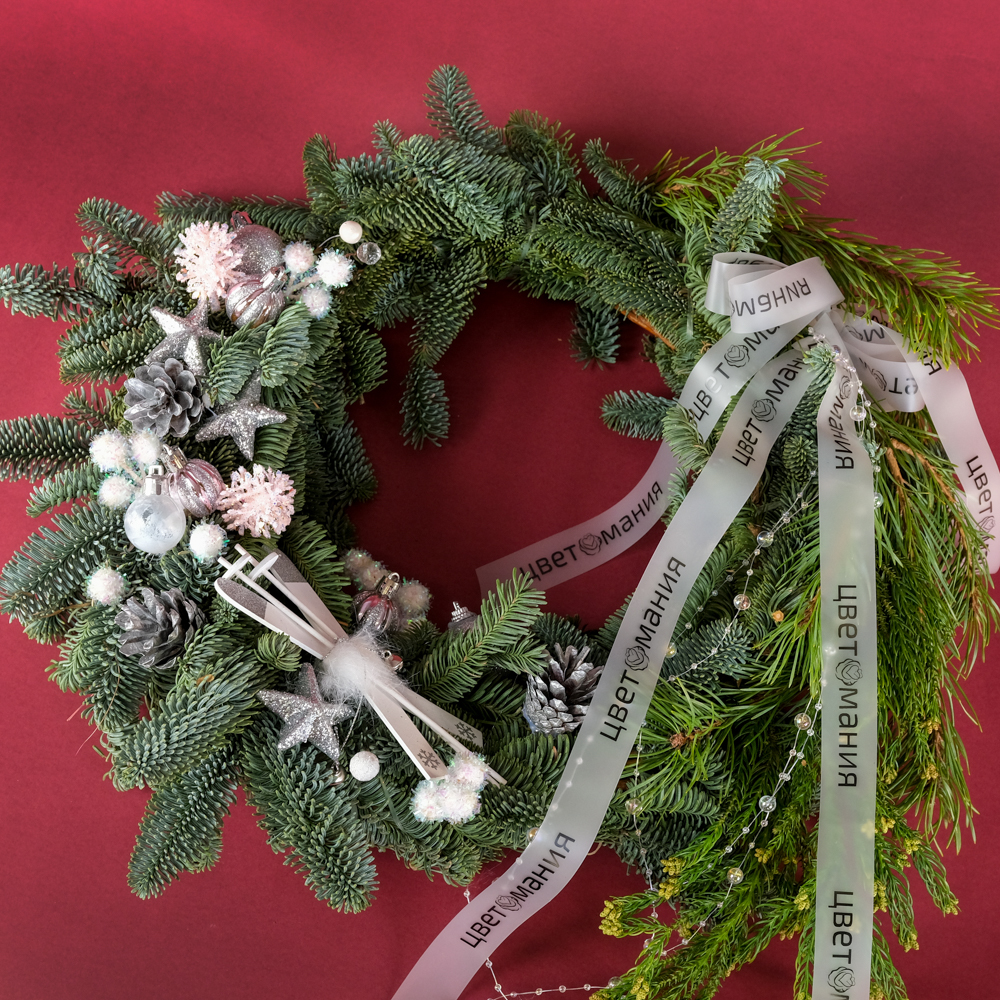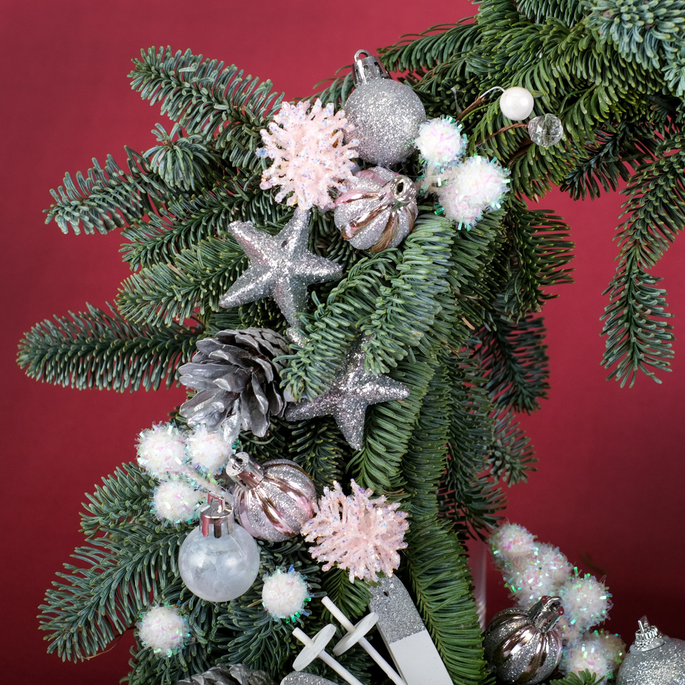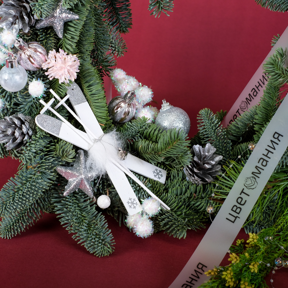 нобилис 1,5, сосна 1, криптомерия 1, лыжи 1, шар d3 7, звезда на вставке 3, ветка с бусинами и цветочками1, шишка с глиттером 3, ветка с глиттером 3, ягоды на проволоке 5, бусы жемчужные 0,1, венок ива d30, лента