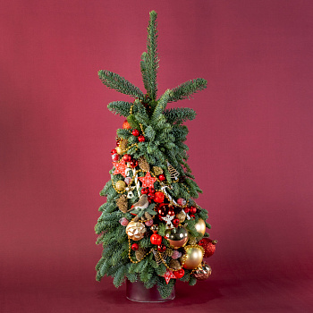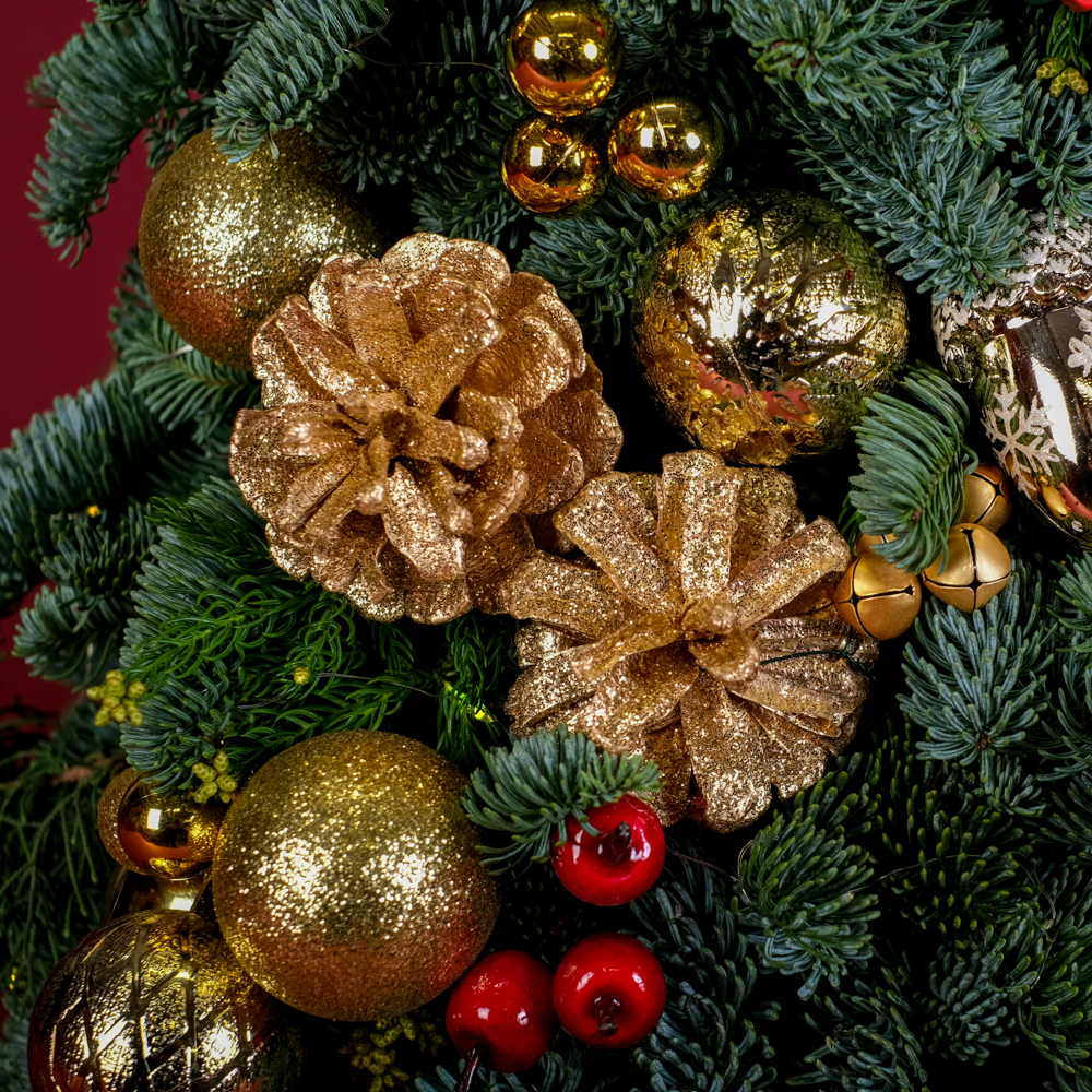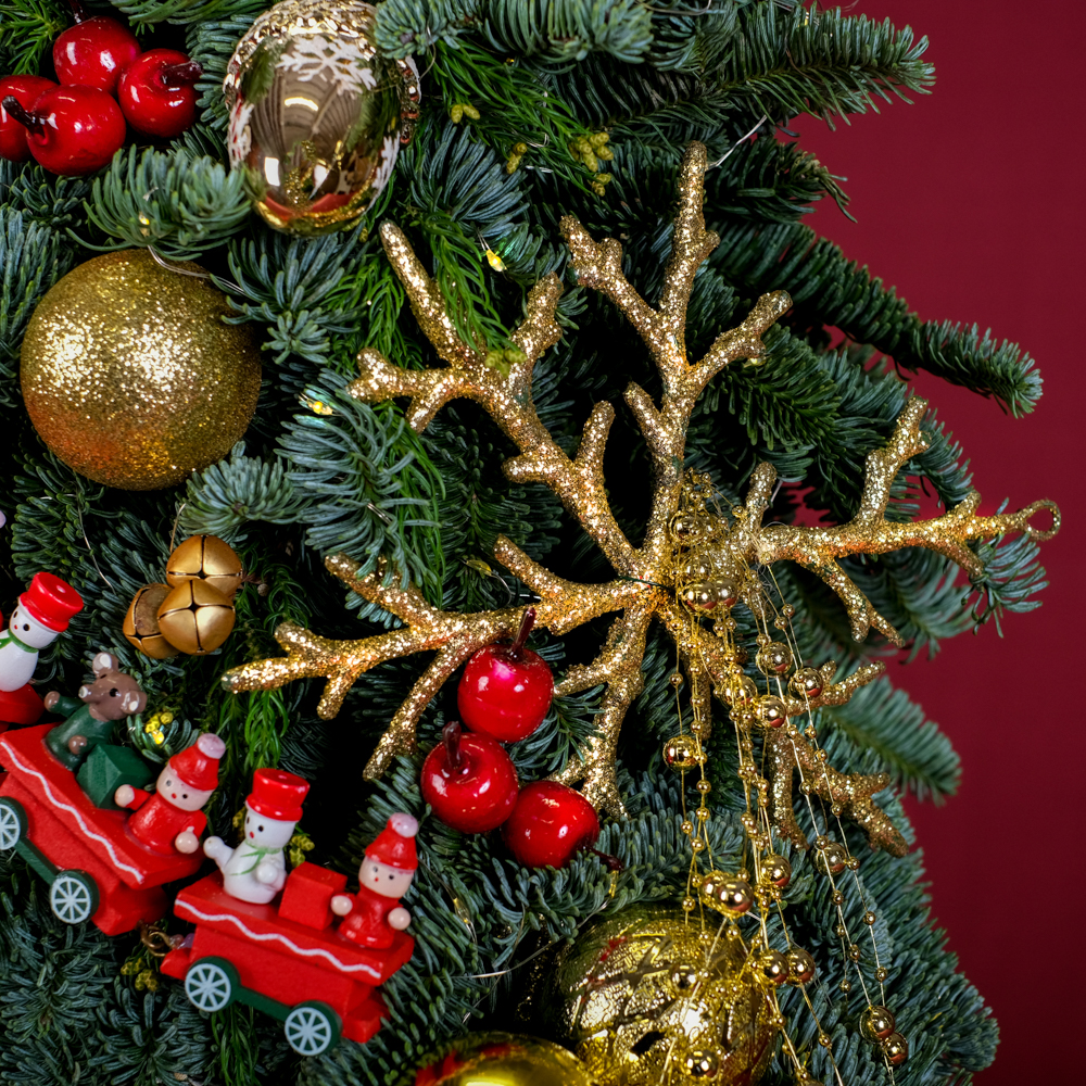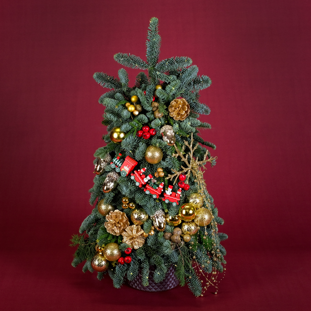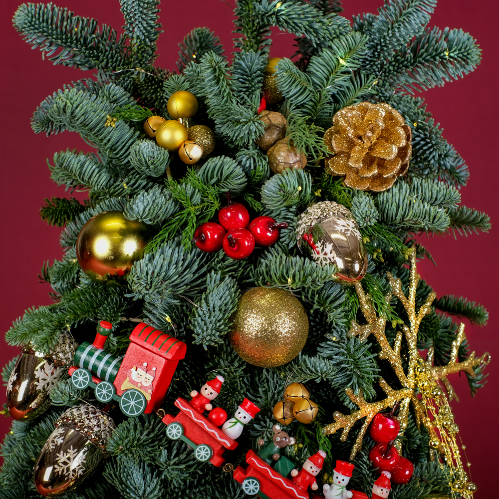 оазис-6, елочные украшения-28, шишка сосновая в глиттере-3, декор Бусы жемчужные (3мм+8мм*60)-0,2, горшок керамика Цилиндр грань бордо-1, ягоды на вставке (1,5*13см)-5, зелень кипарис-0,3, украшение Подвеска-1, украшение-Паровоз-1, гирлянда Роса (5м)-2, нобилис-2,5
