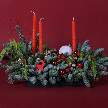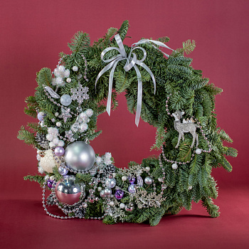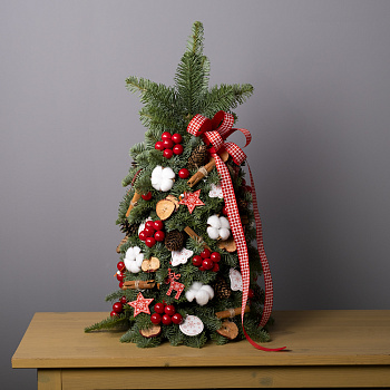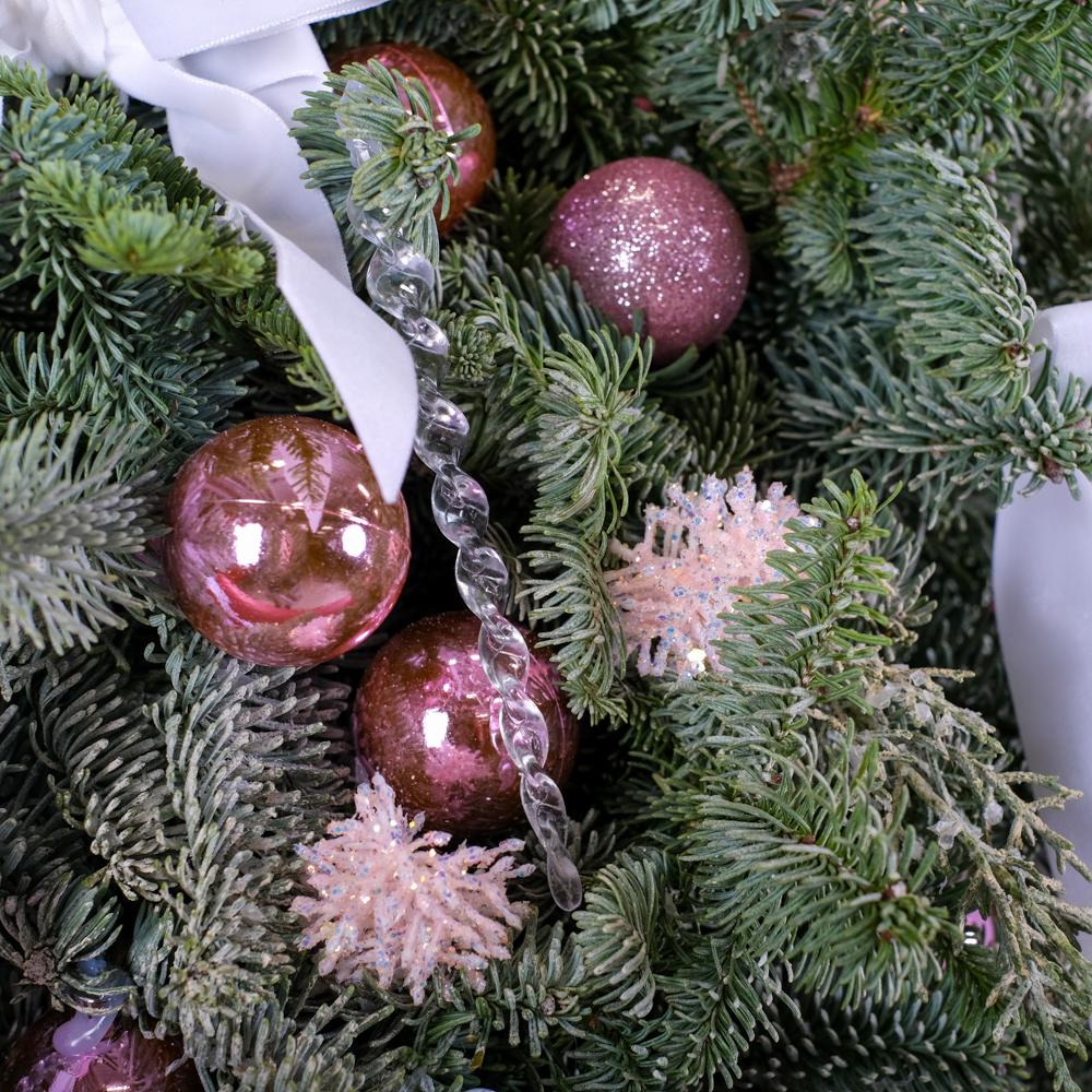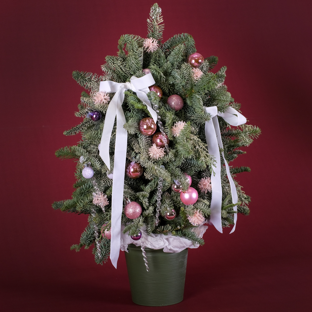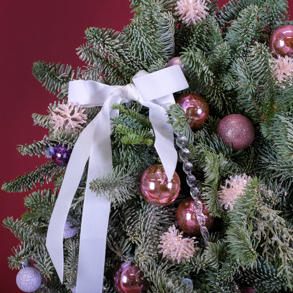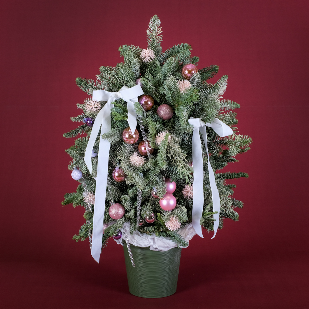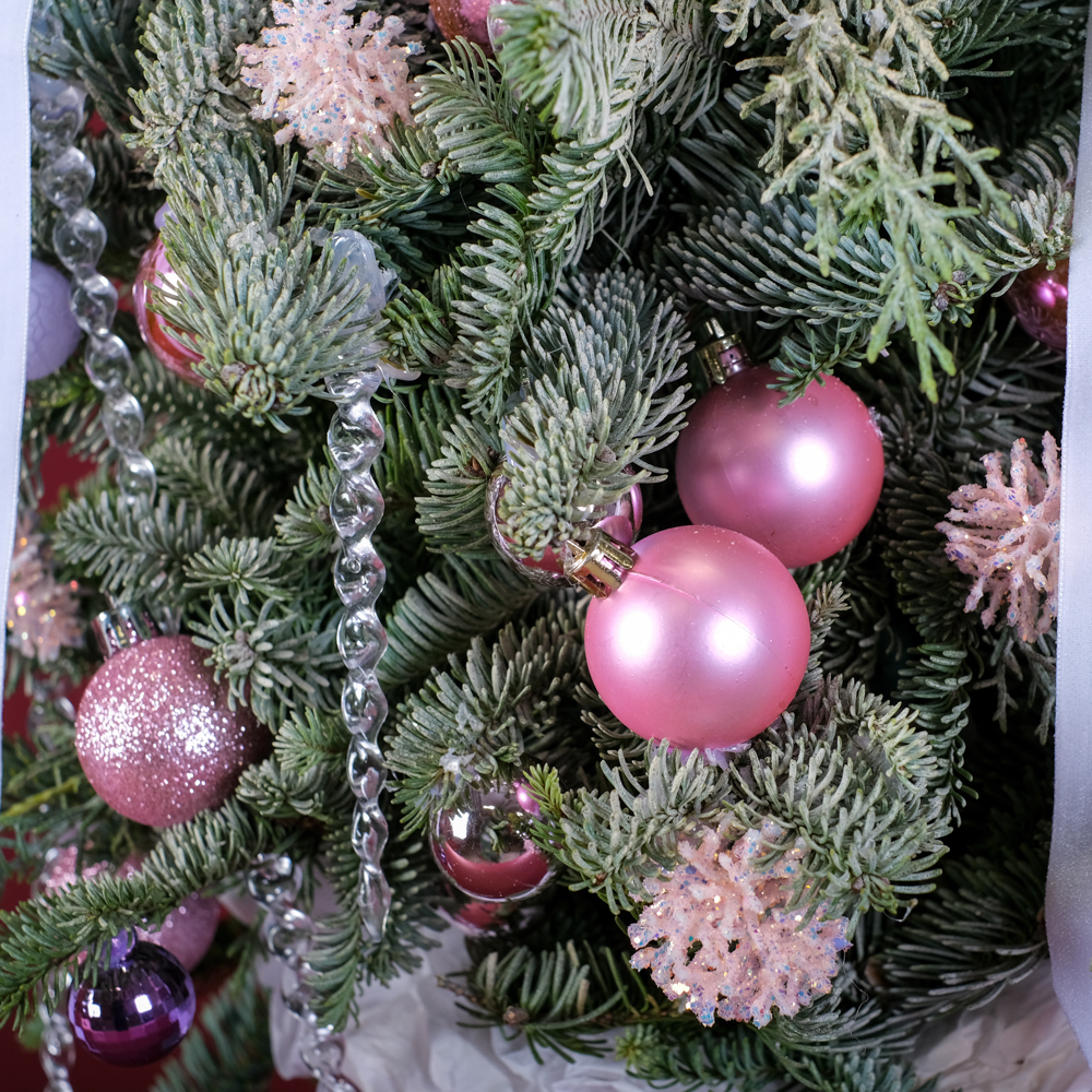шар 15, сосулька 7, ветка с глиттером 10, кипарис 4, шар 11, нобилис 2,5, горшок, тишью, лента, оазис 6