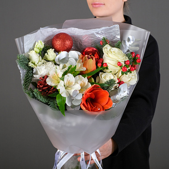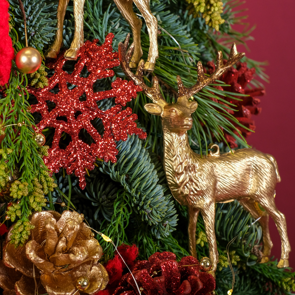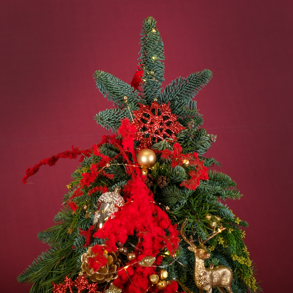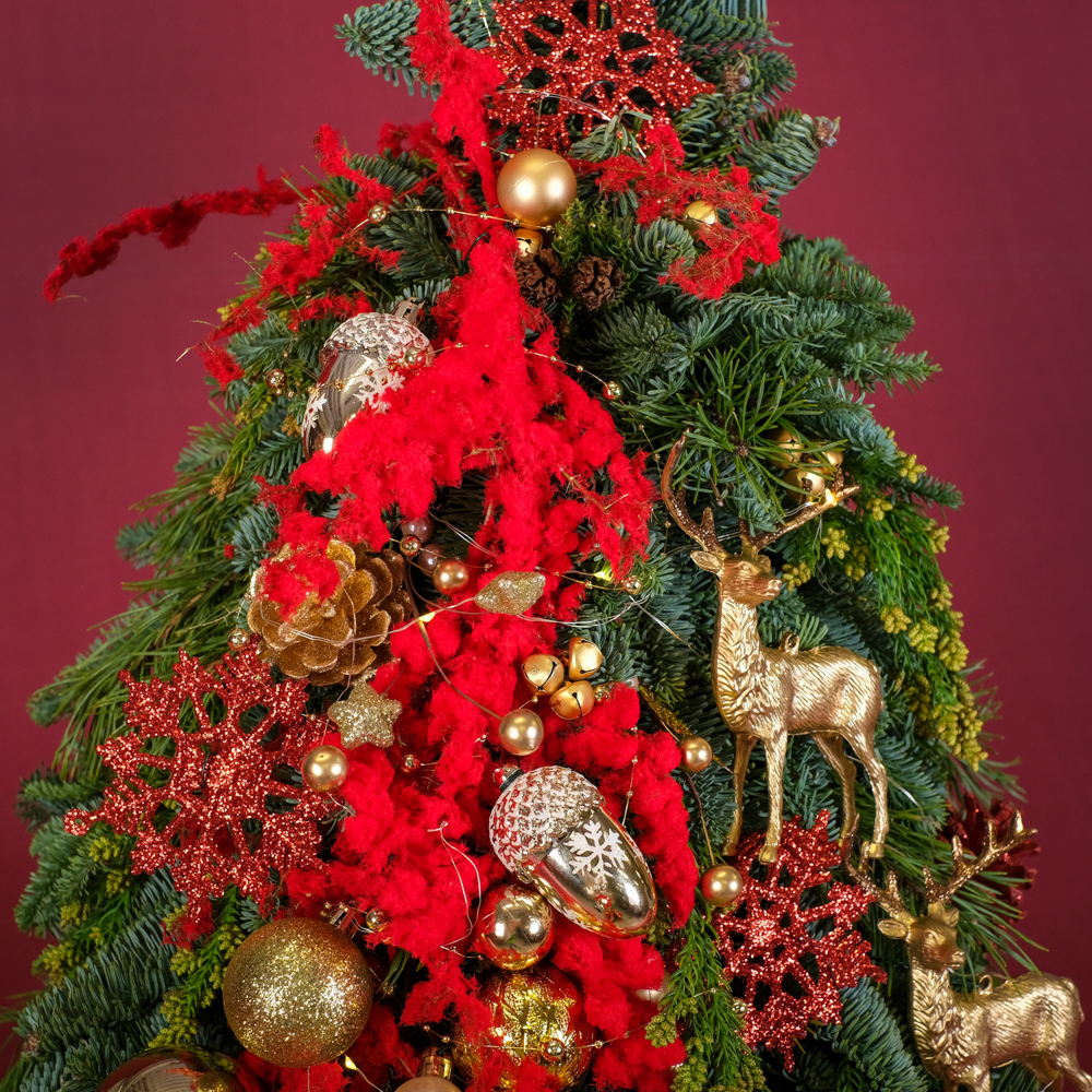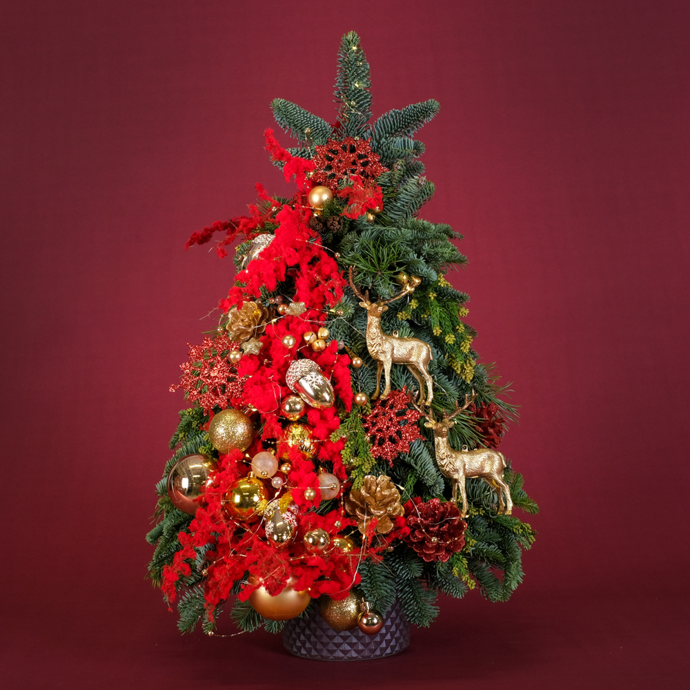 нобилис 3, сосна 0,5, роса 5, снежинка 3, криптомерия 0,5, колокольчики на проволоке 10, олень 2, бусы жемчужные 0,3, шишка в глиттере 4, ветка с бусинами 1, желудь 3, шар 5, шар 3, шар 2, аспарагус заснеженный 0,5, горшок керамика, оазис 9